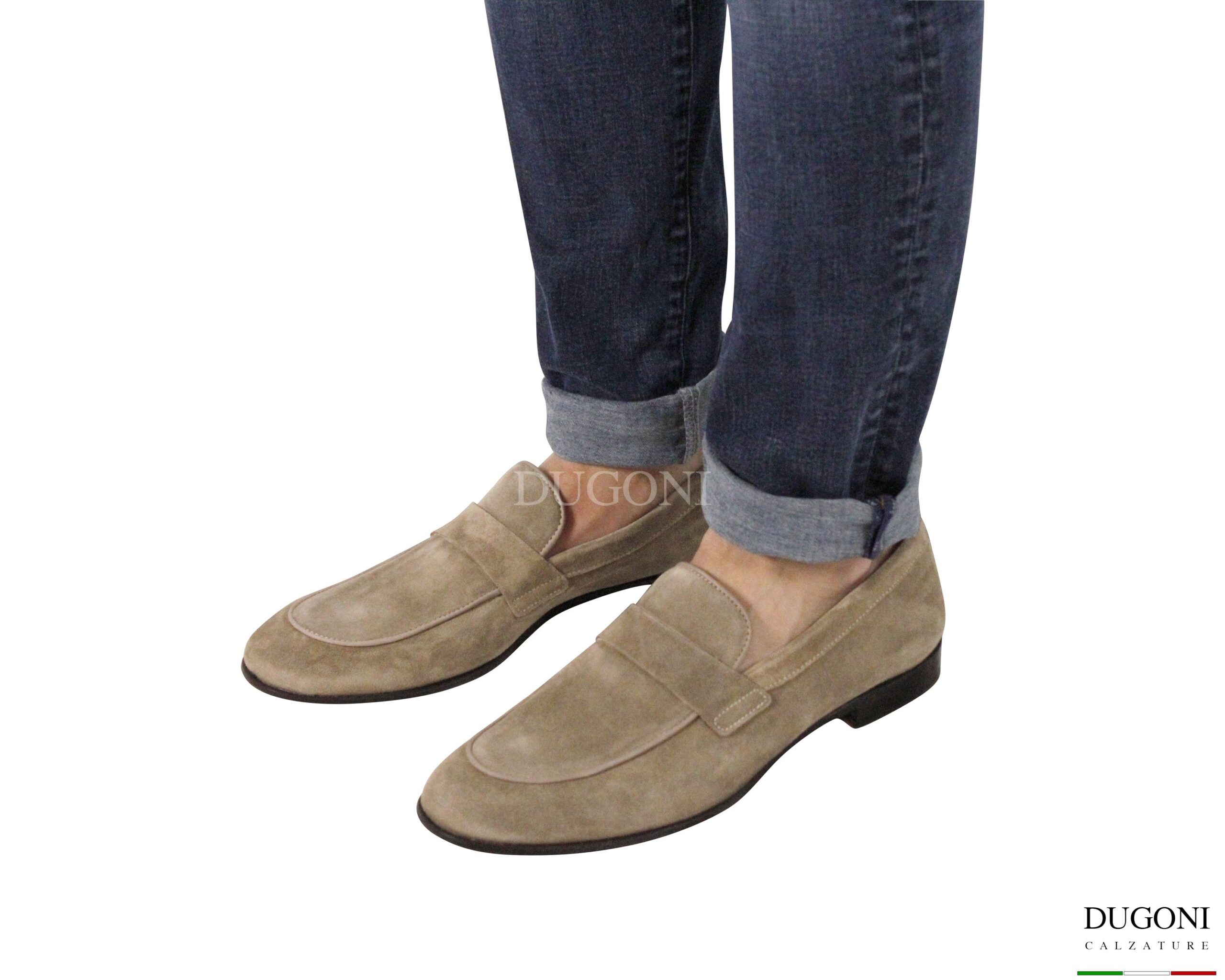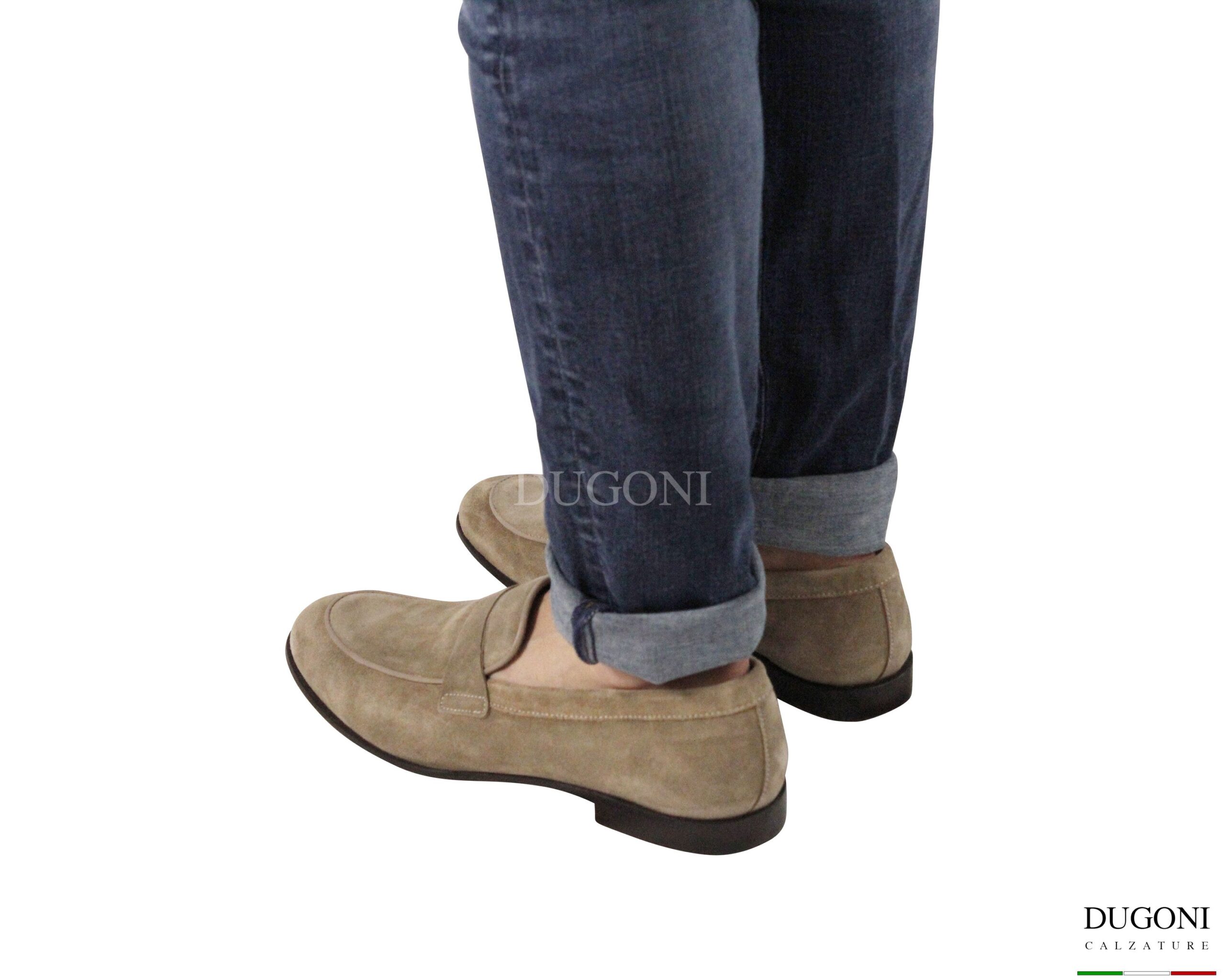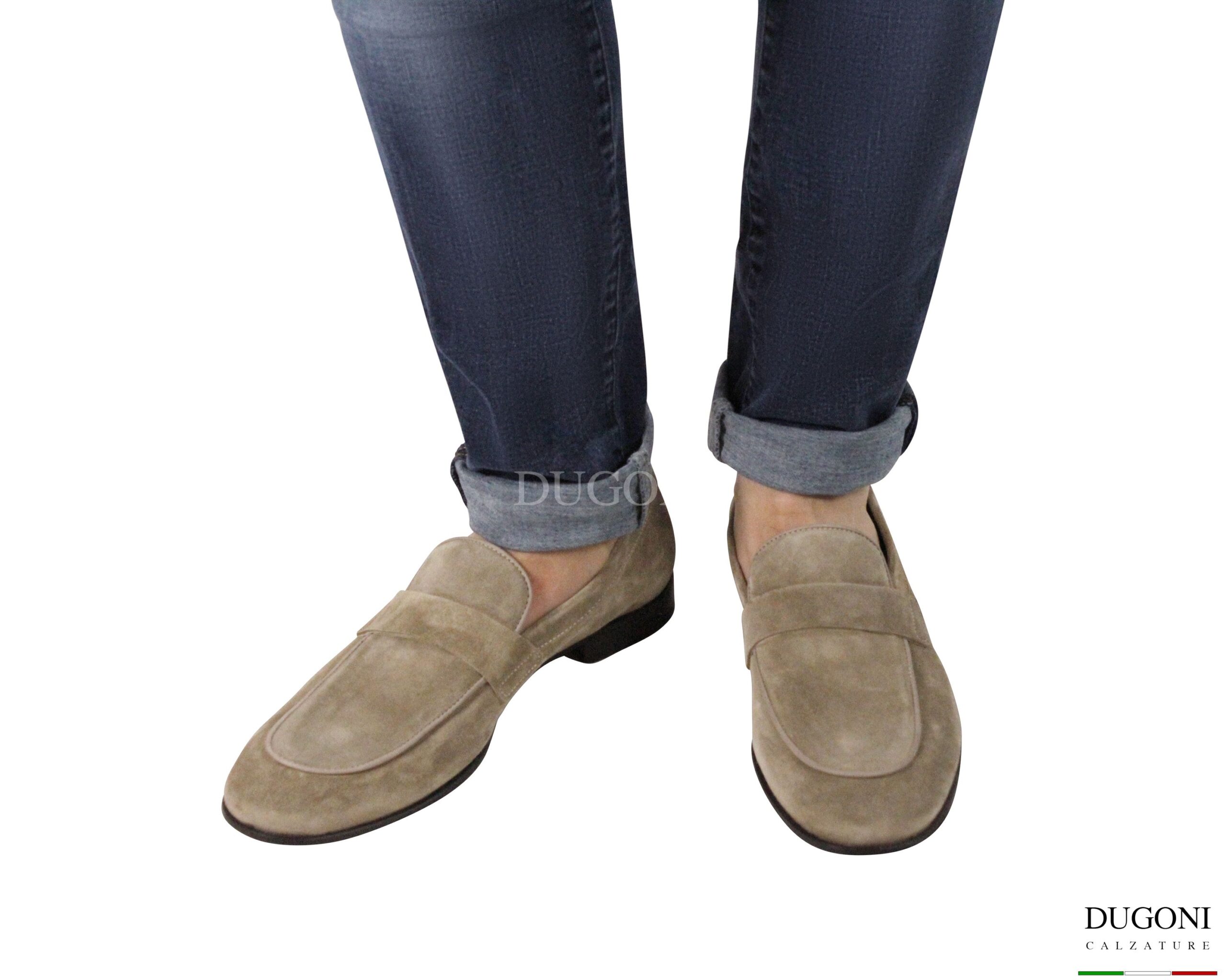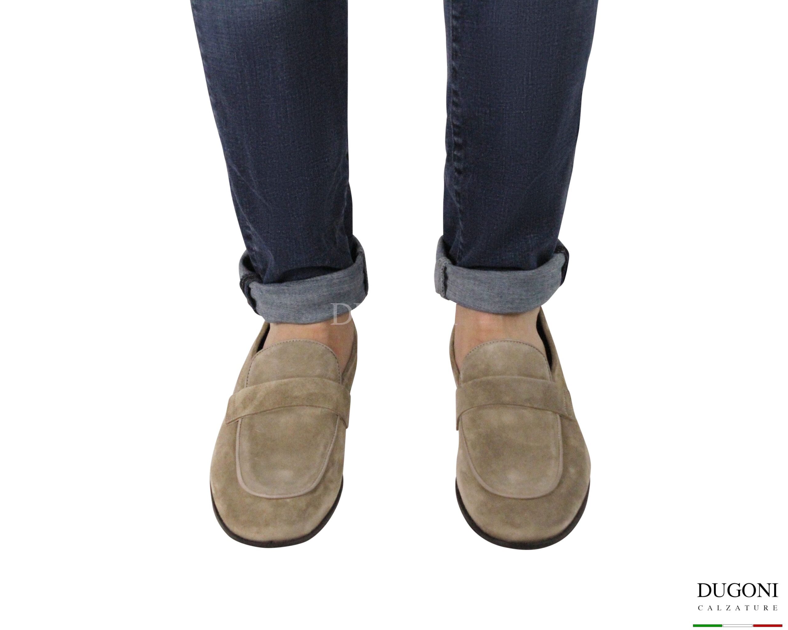 Mocassino scamosciato beige con cuciture in tinta.  Suola cuoio con  cucitura a vista e inserto gomma antiscivolo. Fodera interna in pelle chiara . Lavorazione Blake e suola ribattuta.