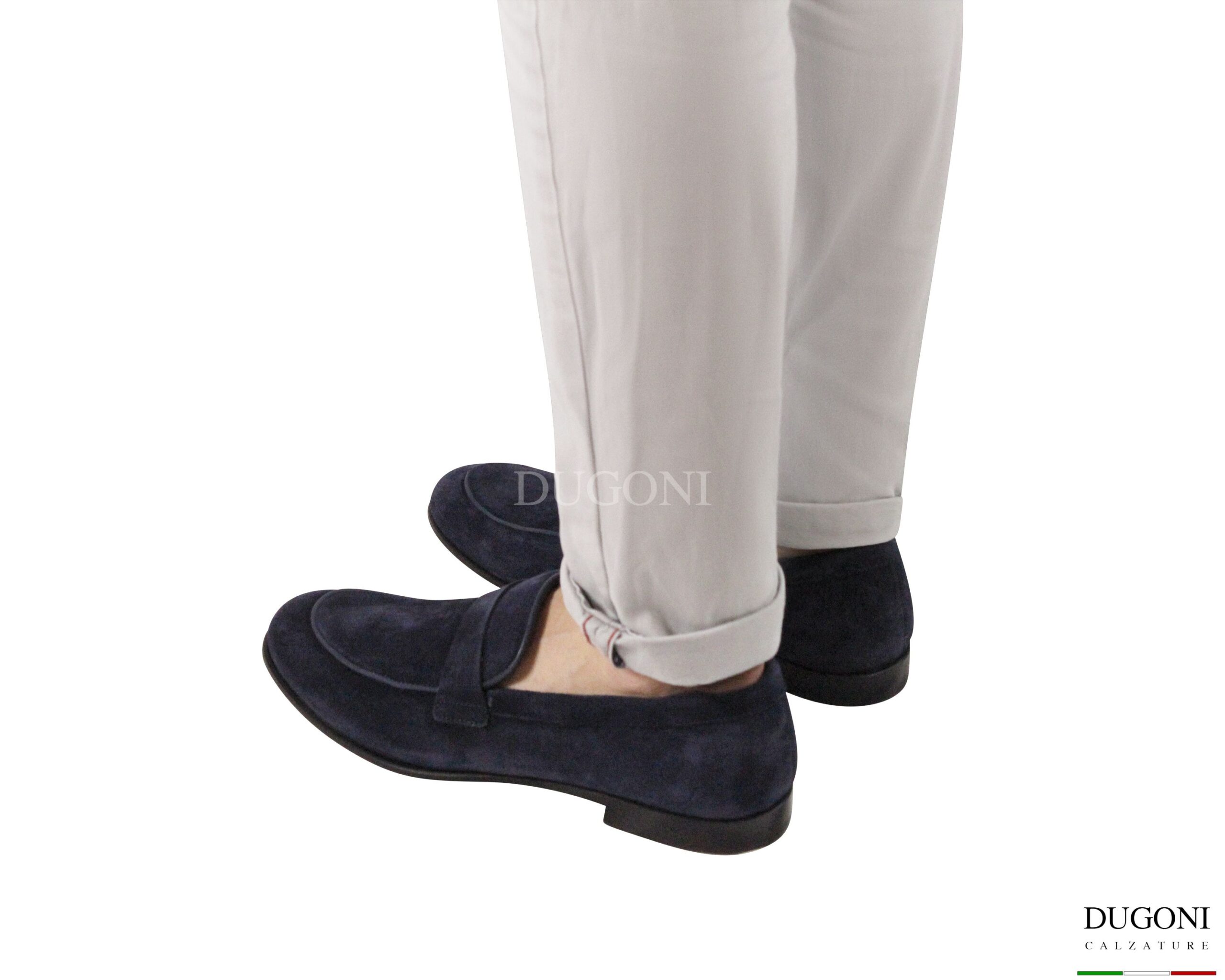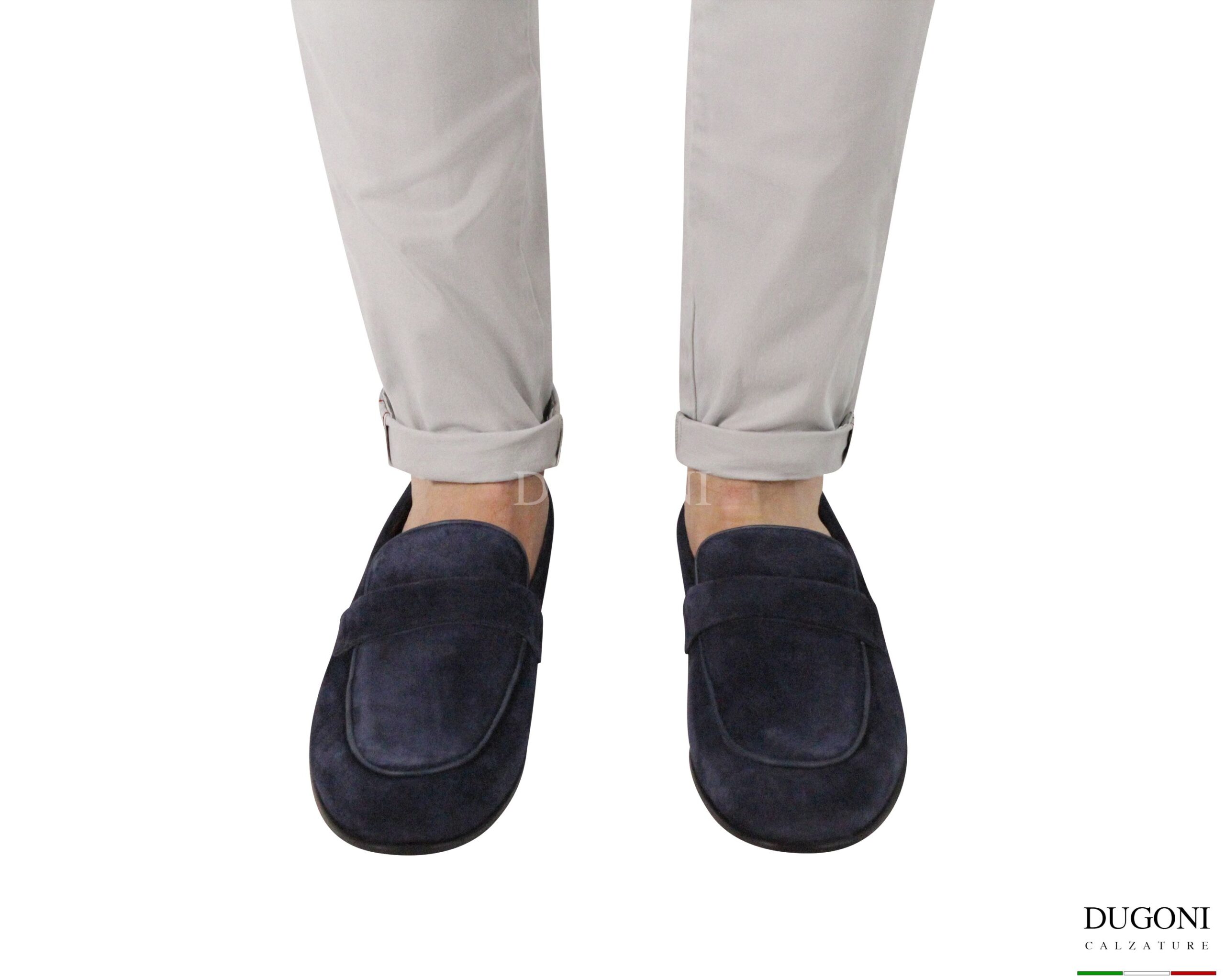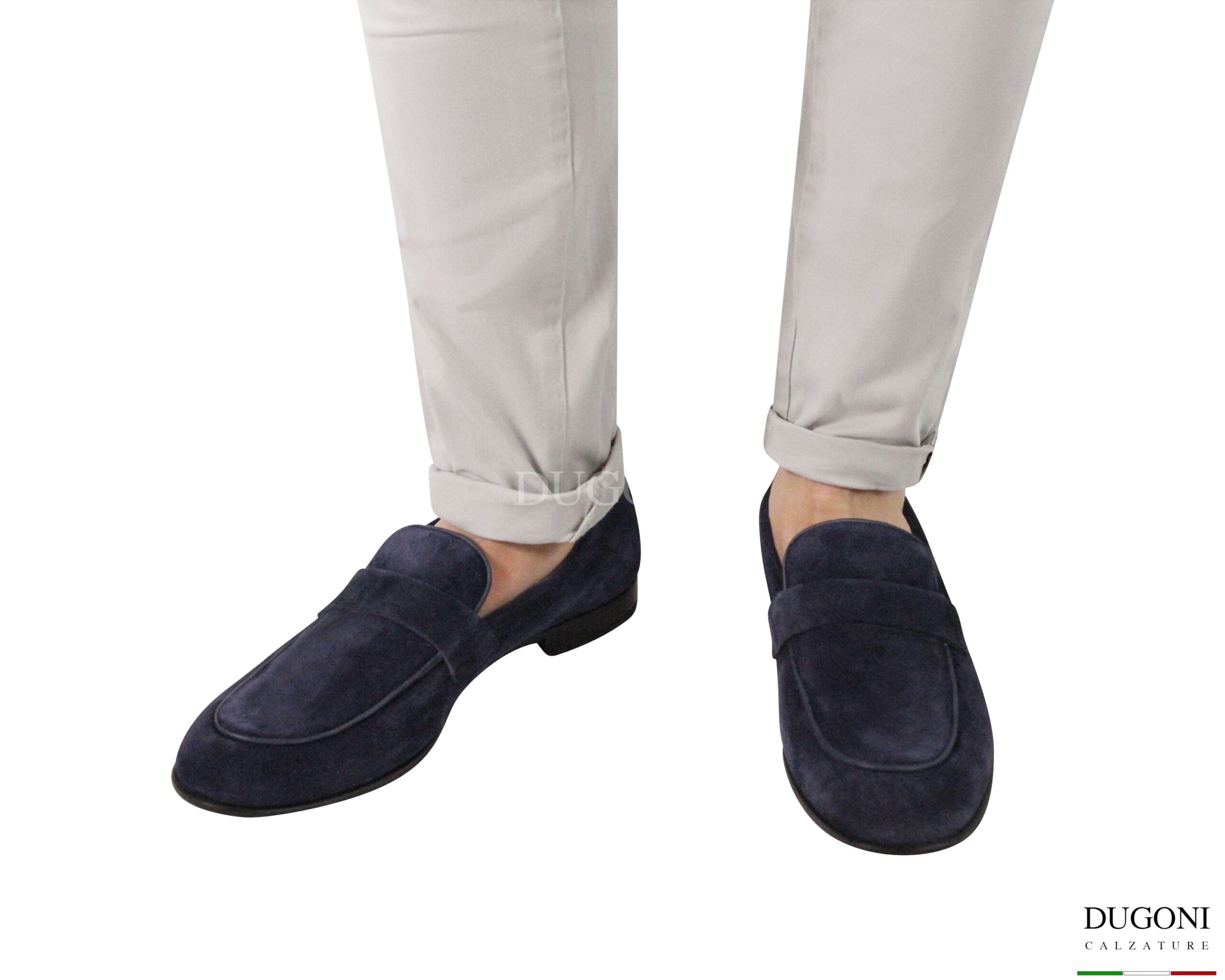Mocassino scamosciato blu con cuciture in tinta. Suola cuoio con cucitura a vista e inserto gomma antiscivolo. Fodera interna in pelle chiara . Lavorazione Blake e suola ribattuta.