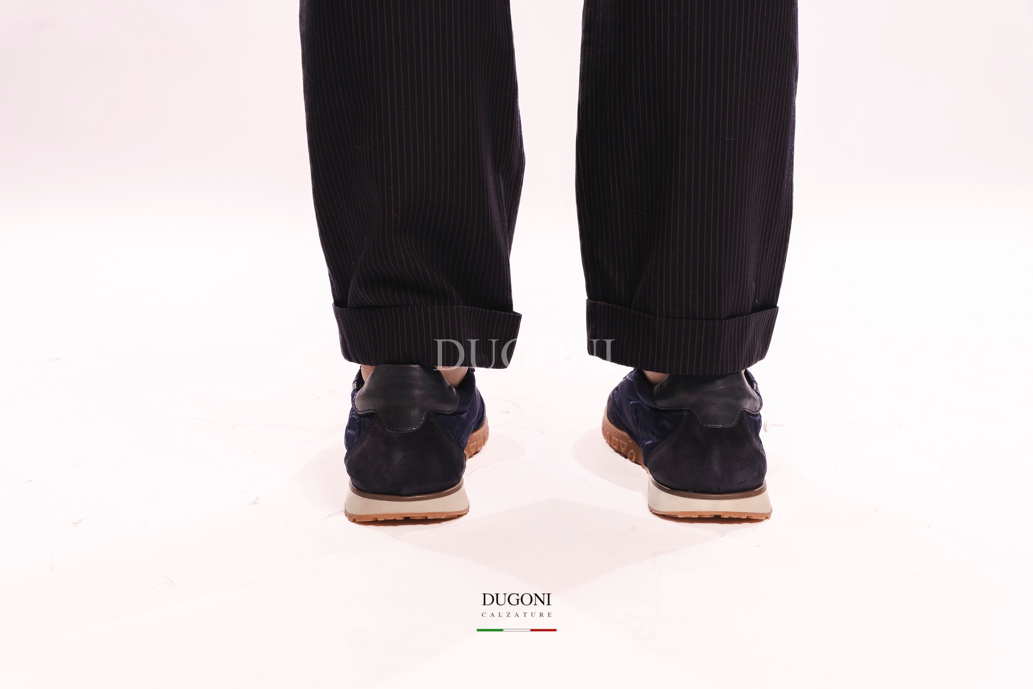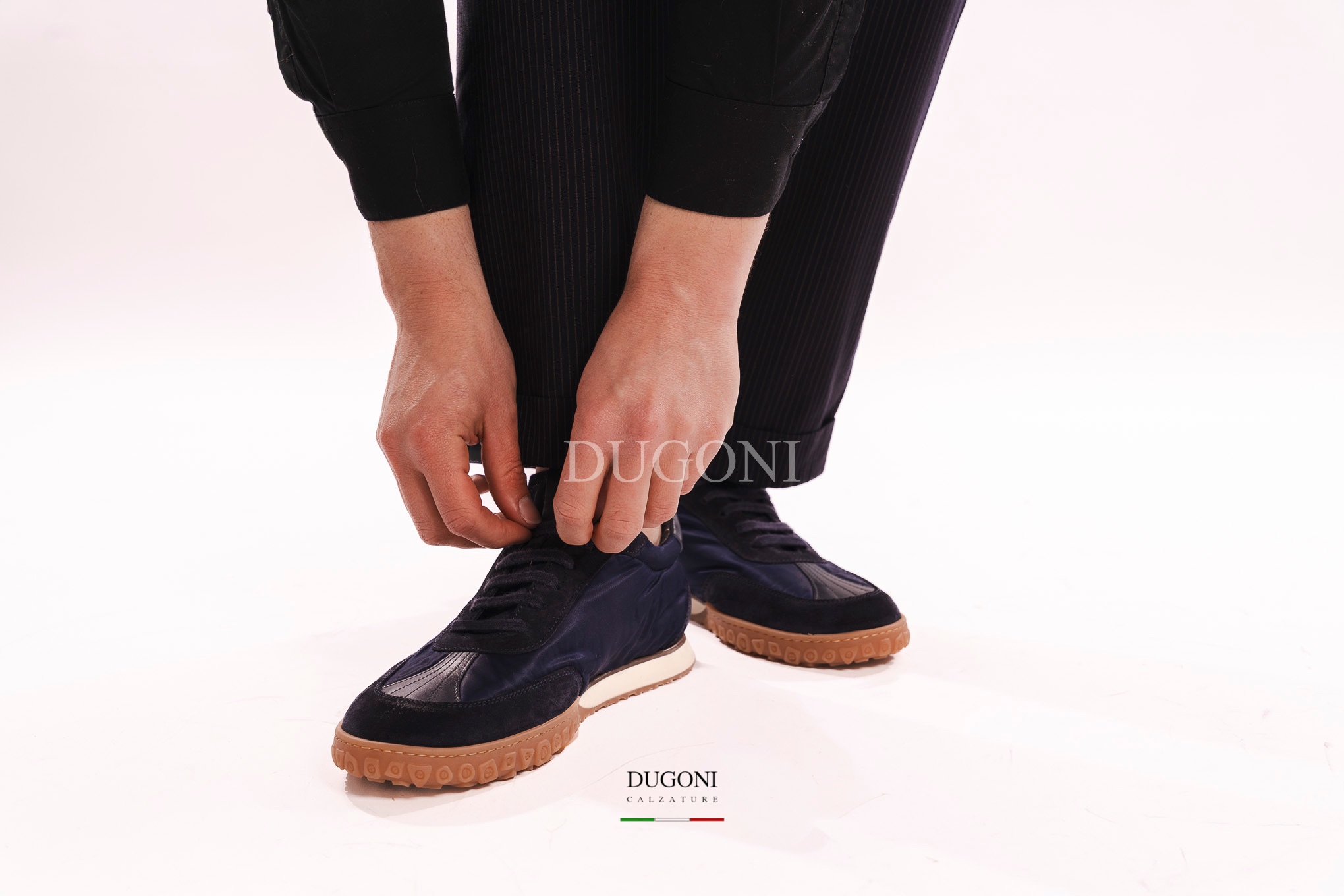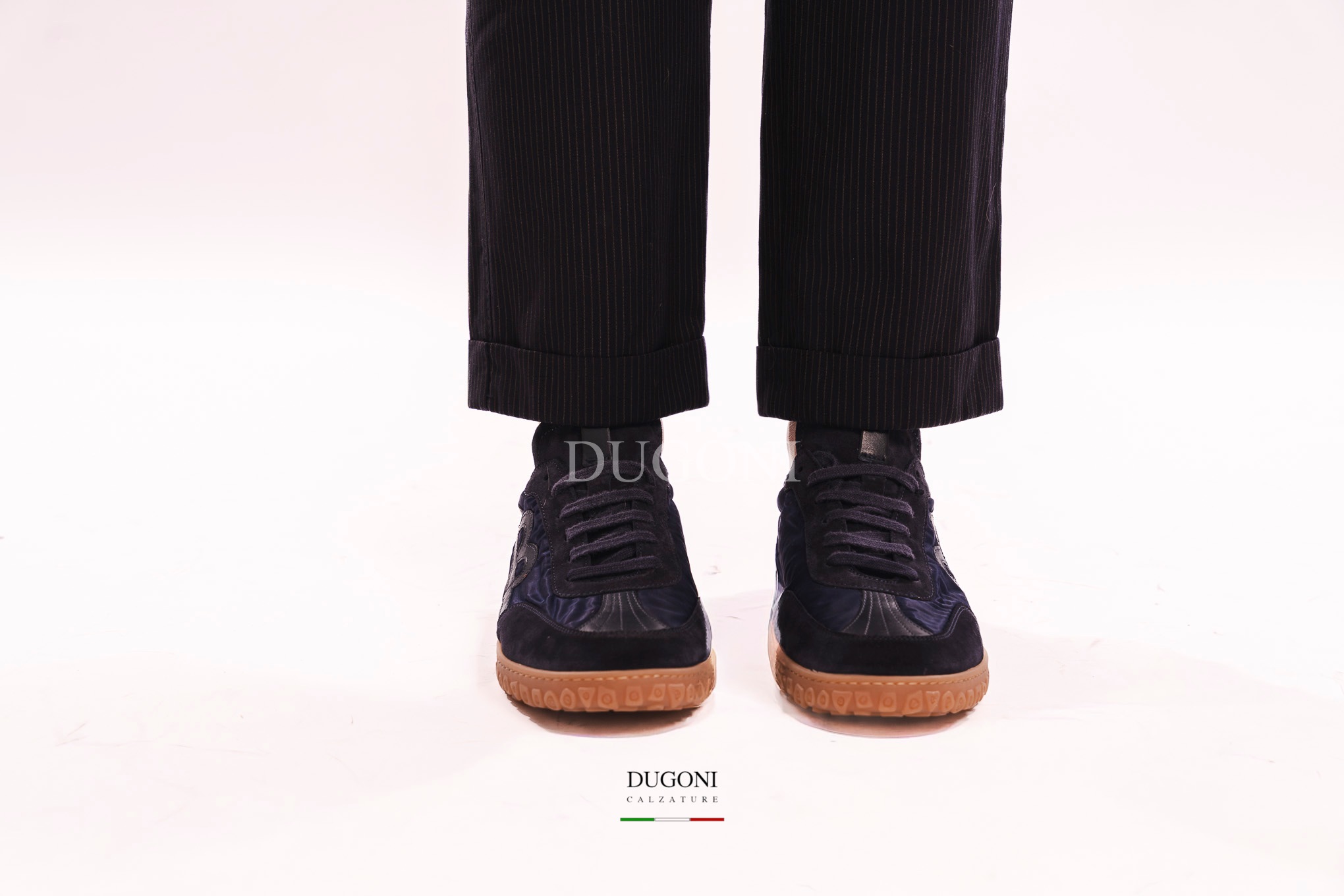 Sneakers in tessuto con dettagli in pelle e in camoscio blu tono su tono. Plantare estraibile. Suola in gomma morbida e flessibile.