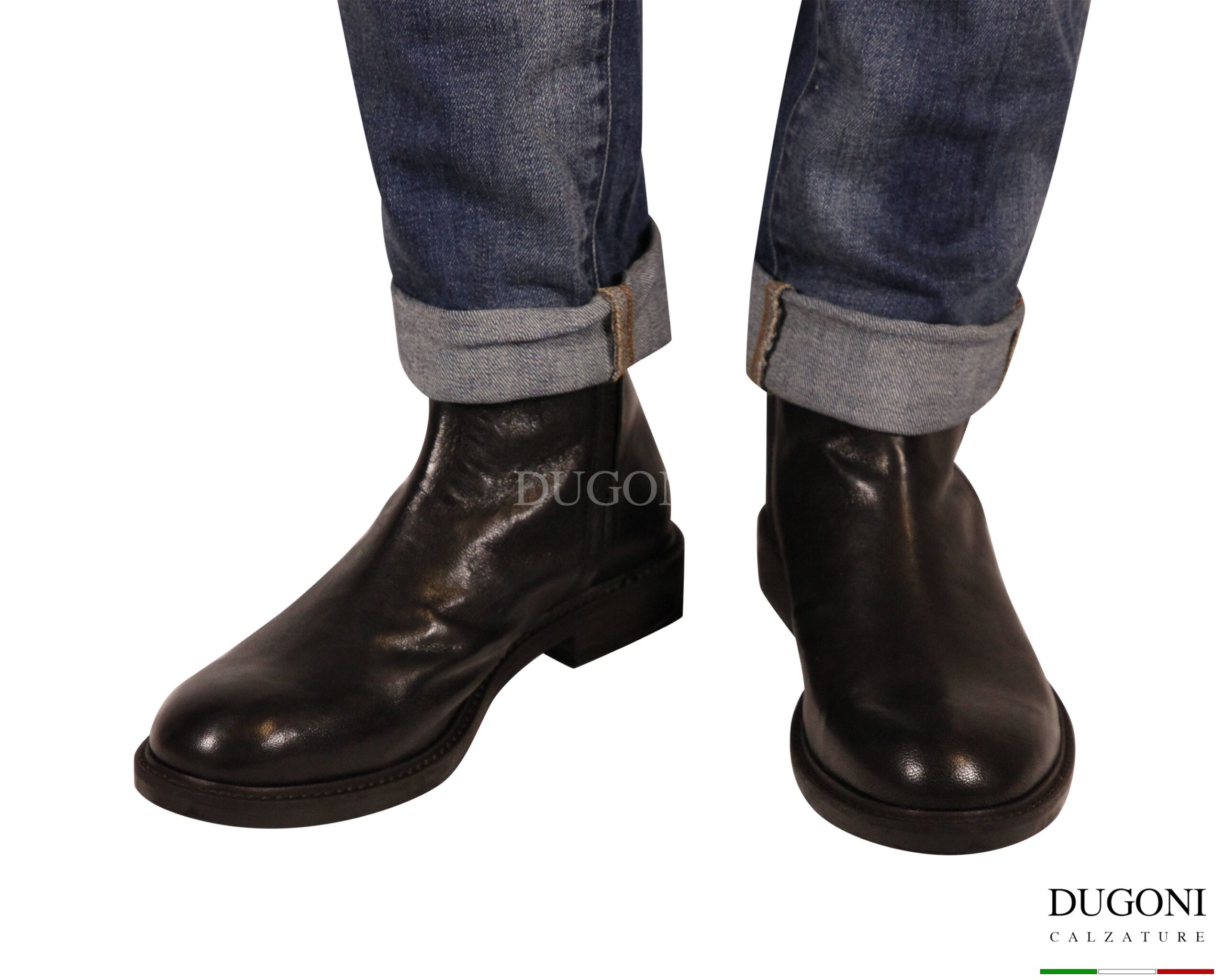 Stivaletto in pelle bufalo nero a tomaia liscia, con doppia cerniera . Cuciture in tinta. Suola in cuoio con cuciture a vista , mezza gomma.
