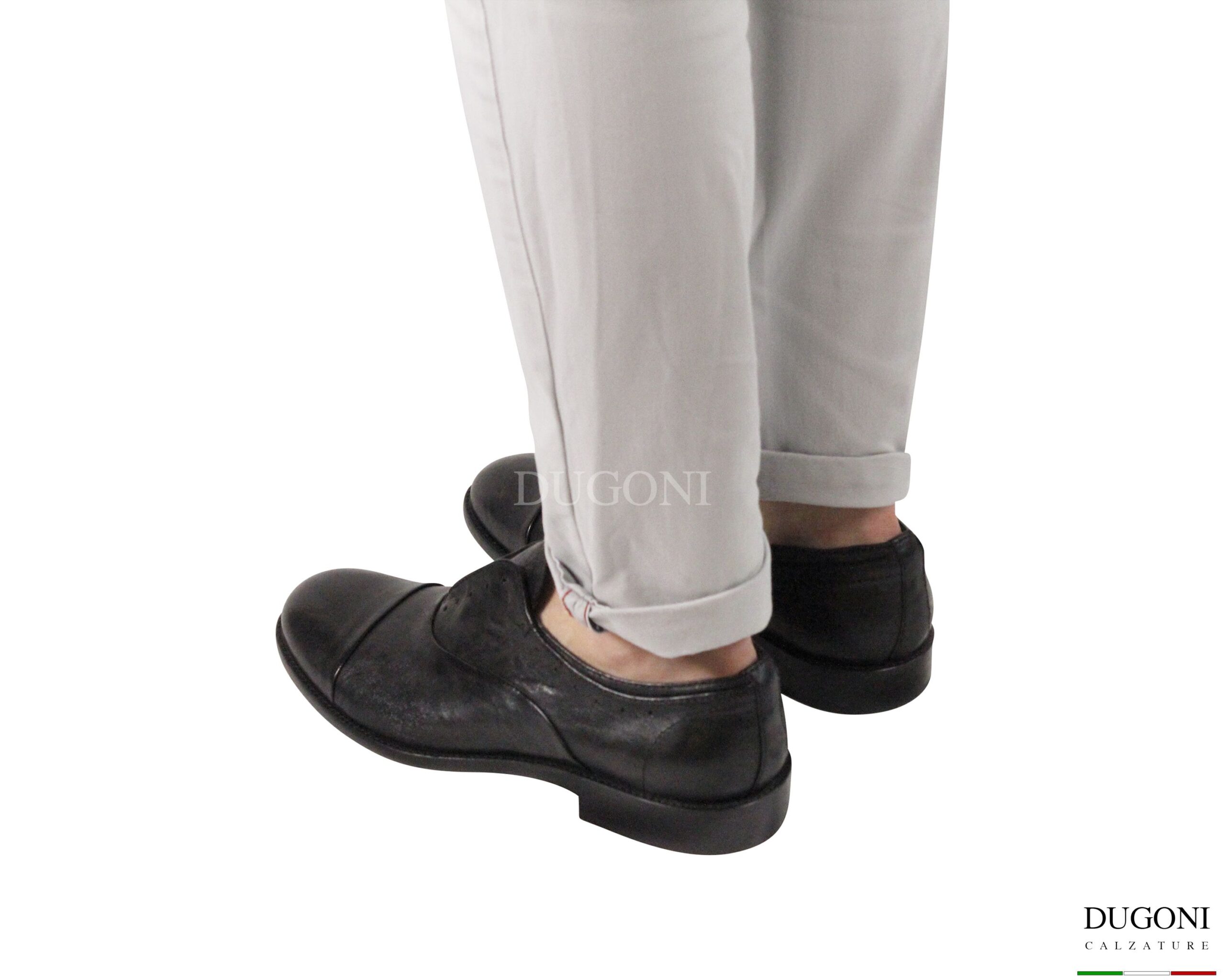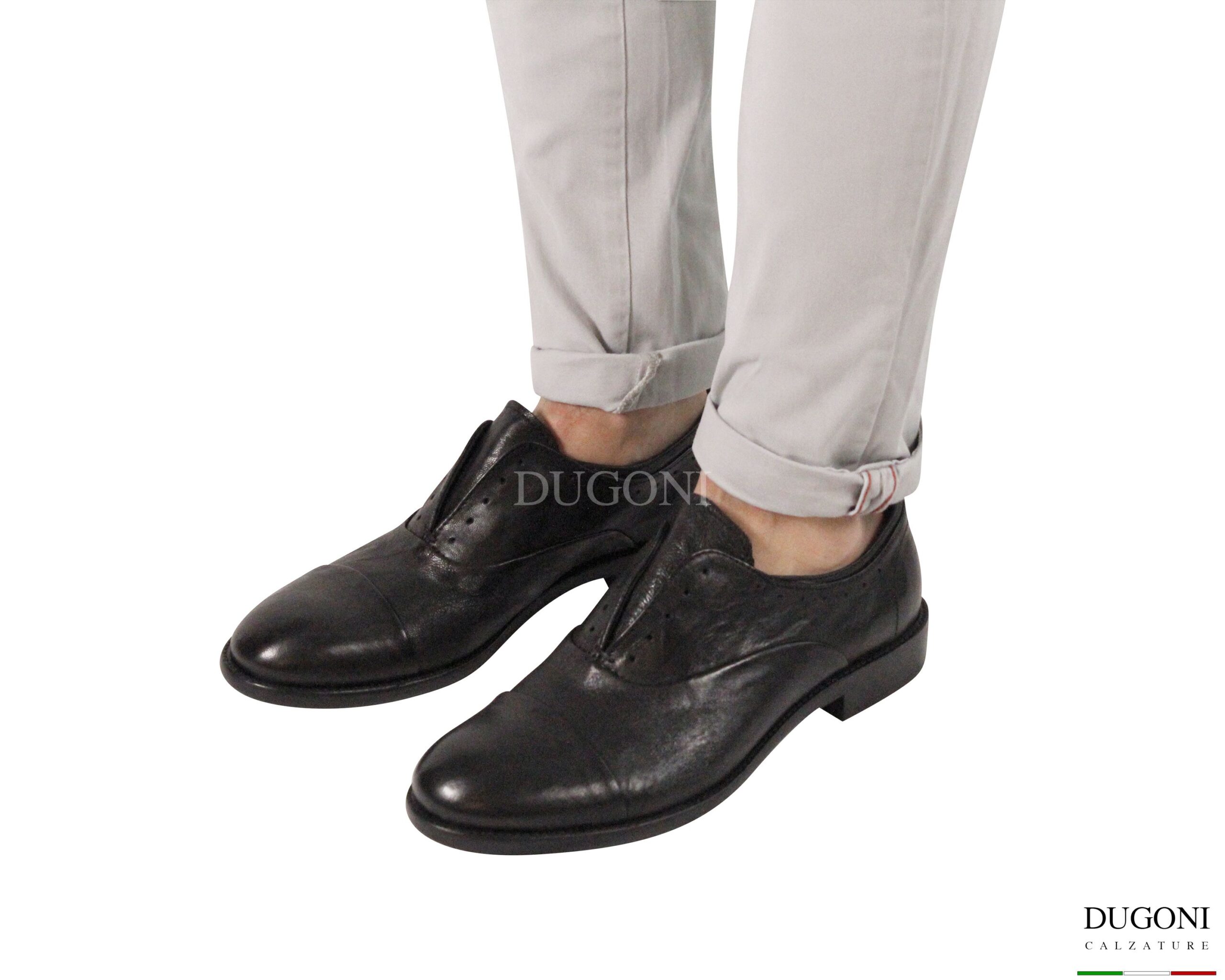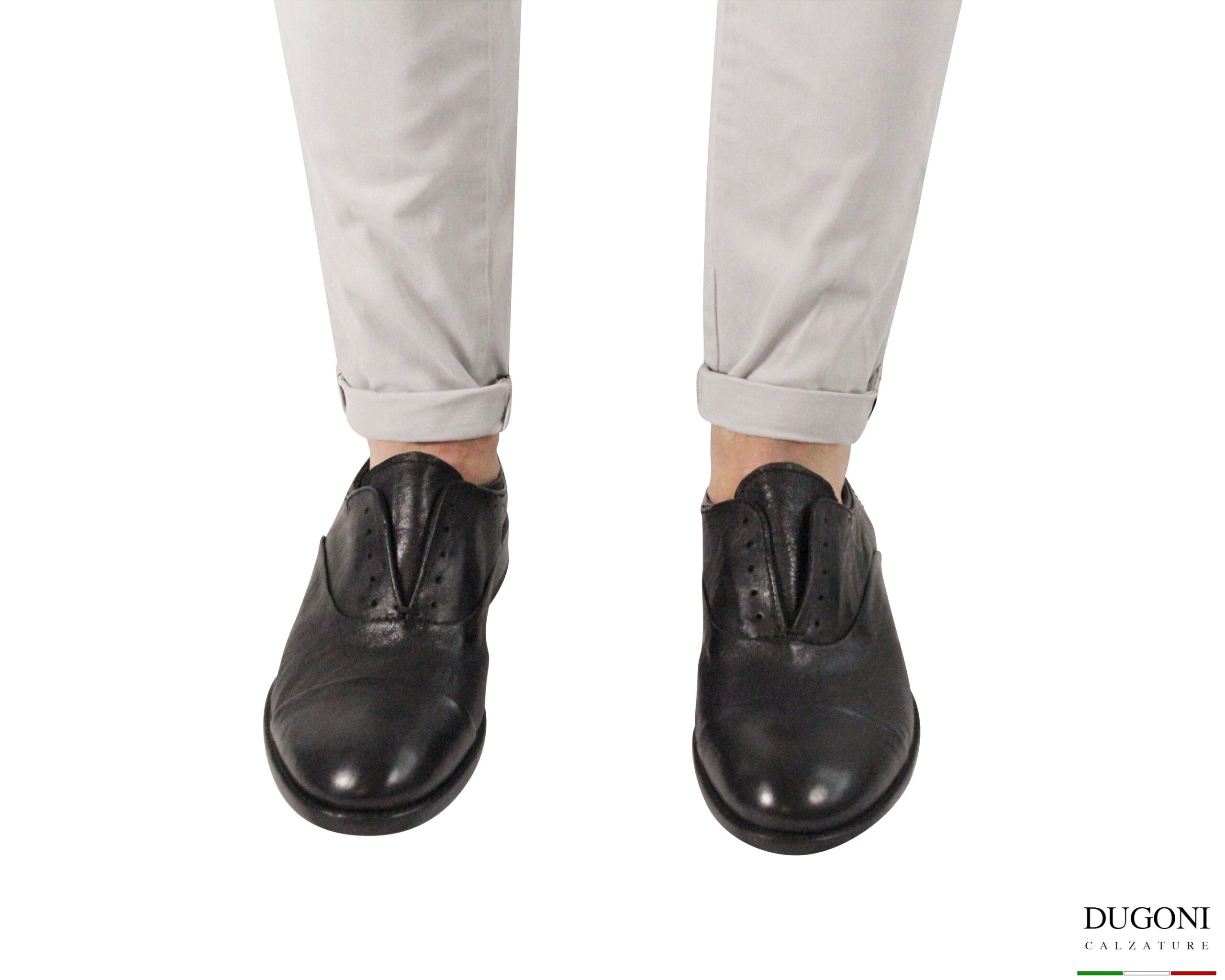 Slip on in pelle nera vintage , con elastico sotto la linguetta. Puntale cucito e rigirato. Tomaia arricchita da motivo a micro fori.
