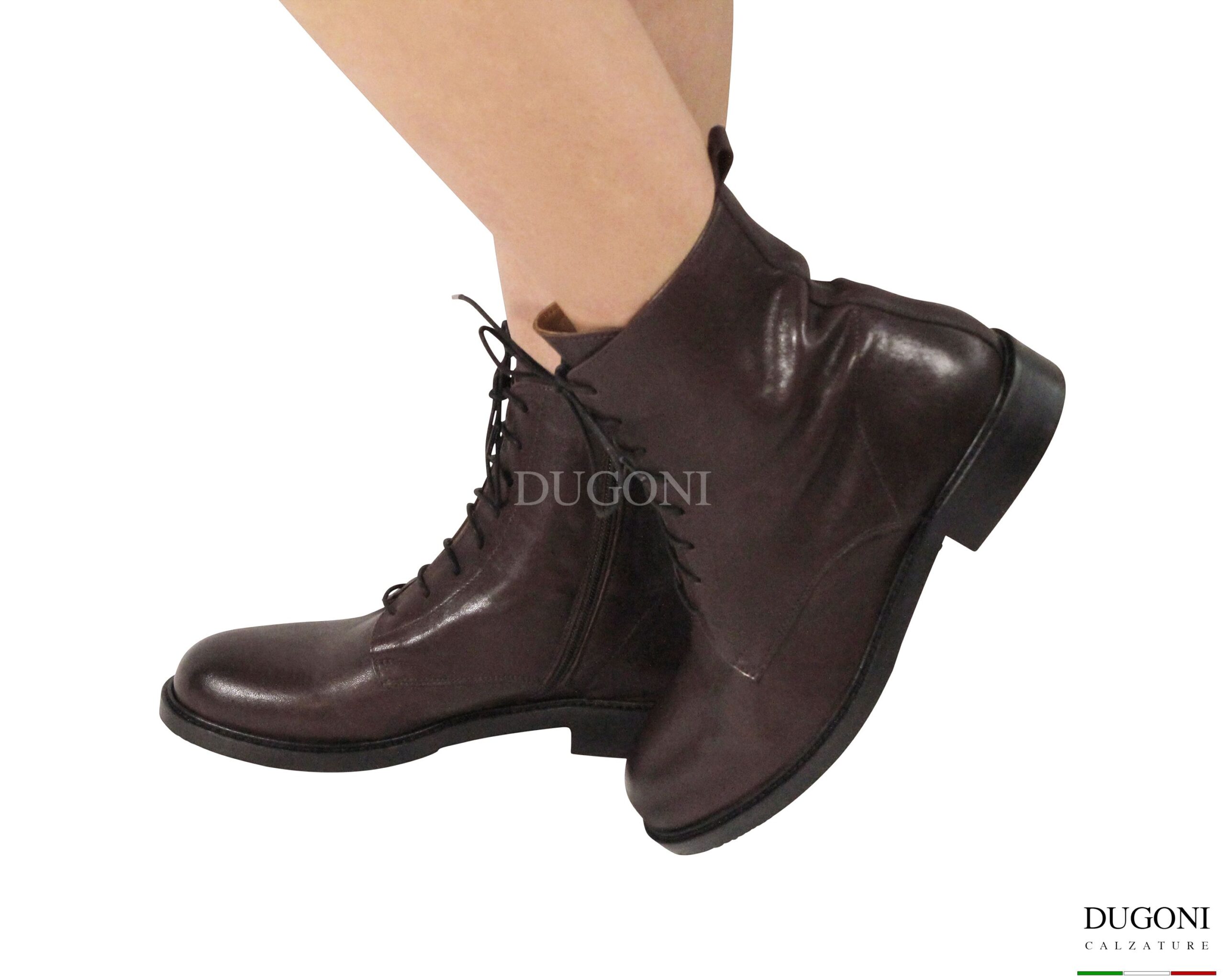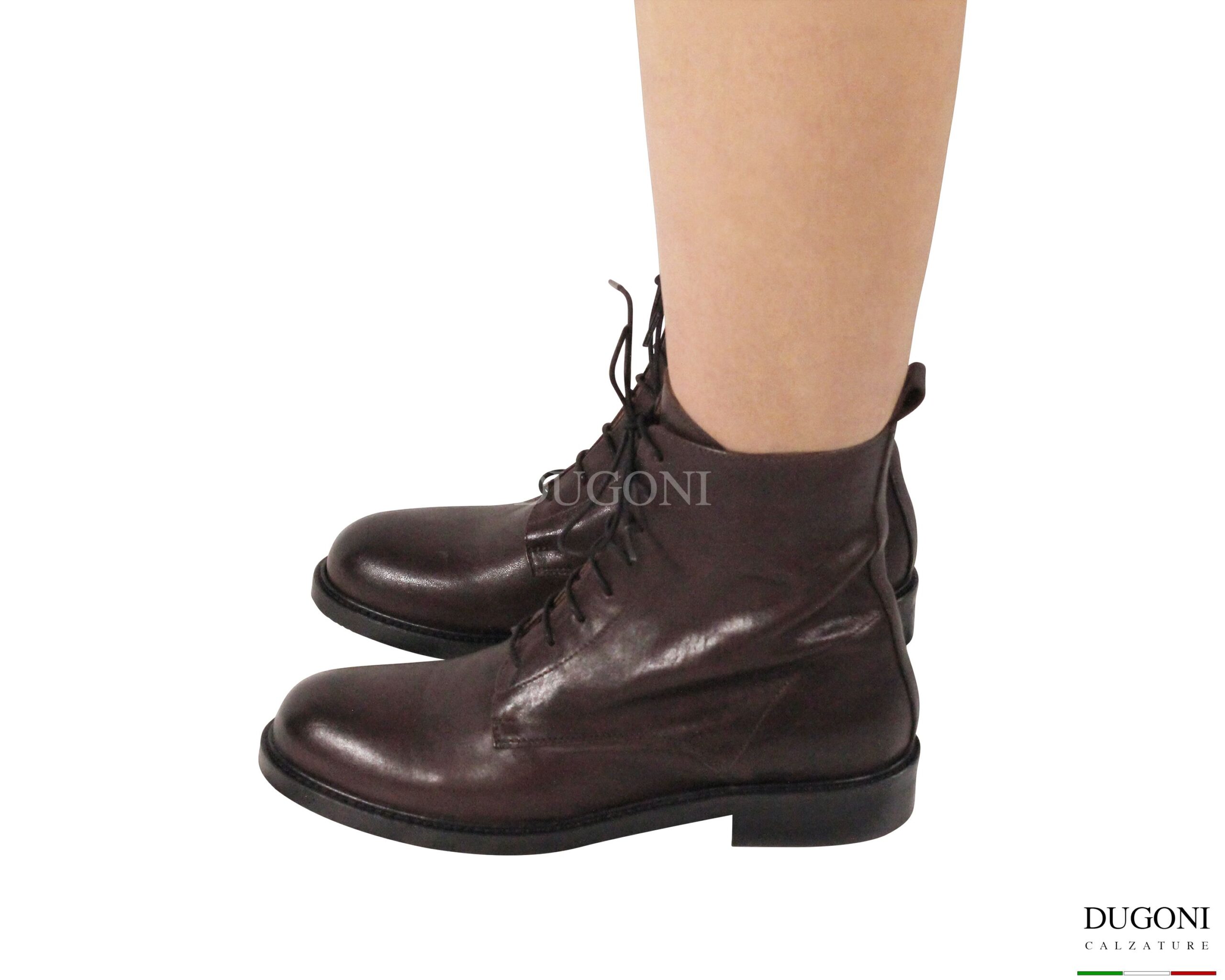 Anfibio tondo, corto a caviglia, in pelle mogano con cerniera interna. Allacciatura a derby con 6 fori. Fondo gomma