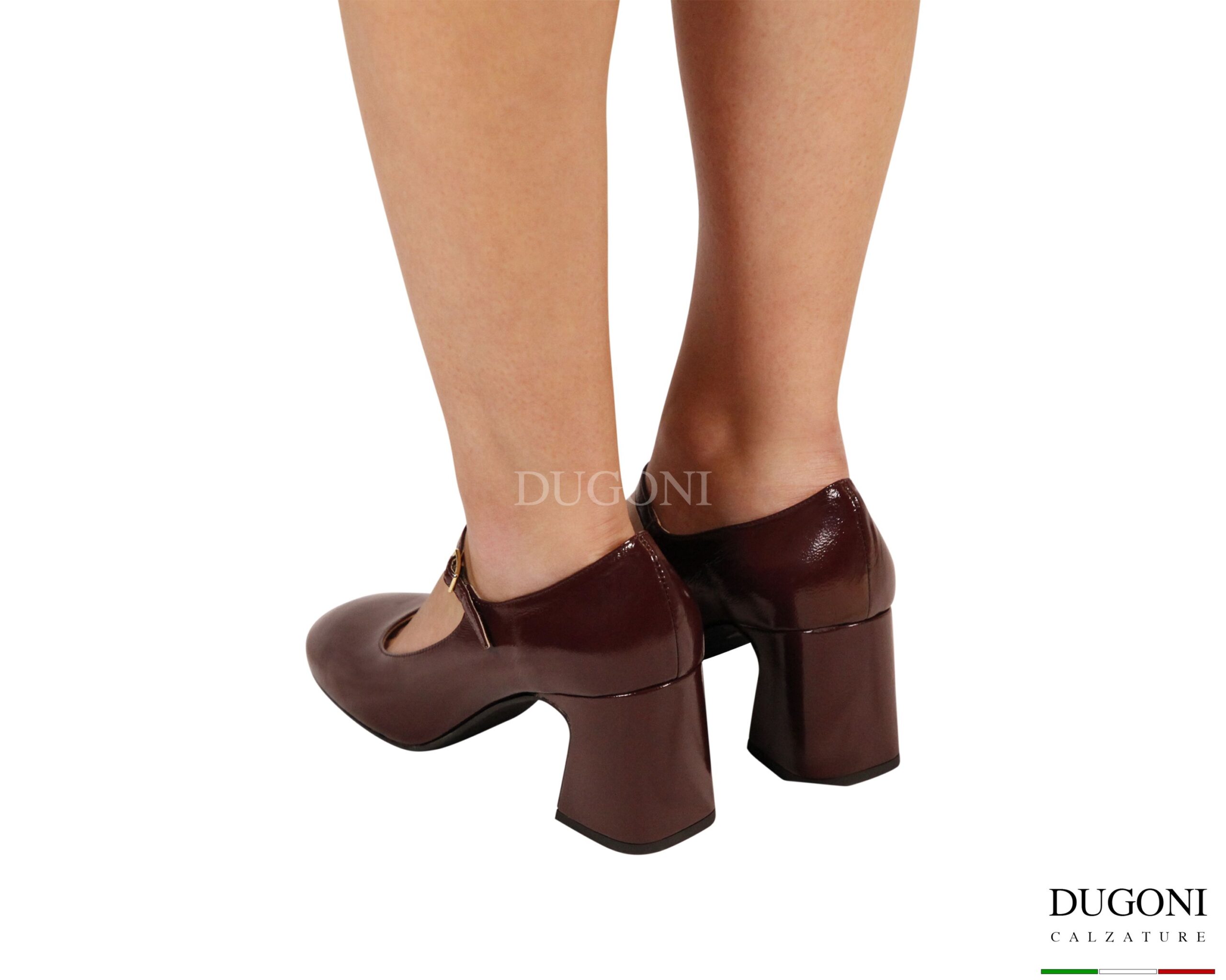 Mary Jane in pelle mogano, un pellame morbido e luminoso . Cinturino regolabile con elastico fibbia dorata . Tacco a coda svasato.