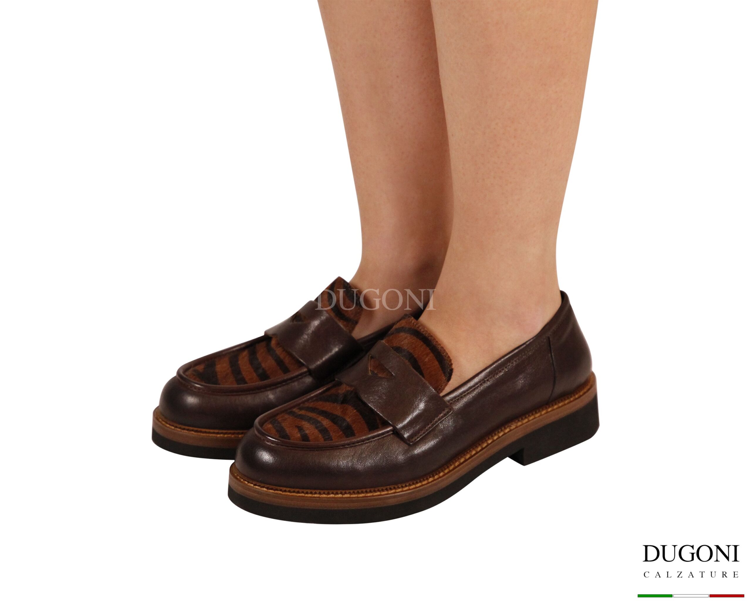 Mocassino in pelle testa di moro con inserto in cavallino zebra nocciola .Guardolo in cuoio cucito . Suola in gomma ExtraLight.