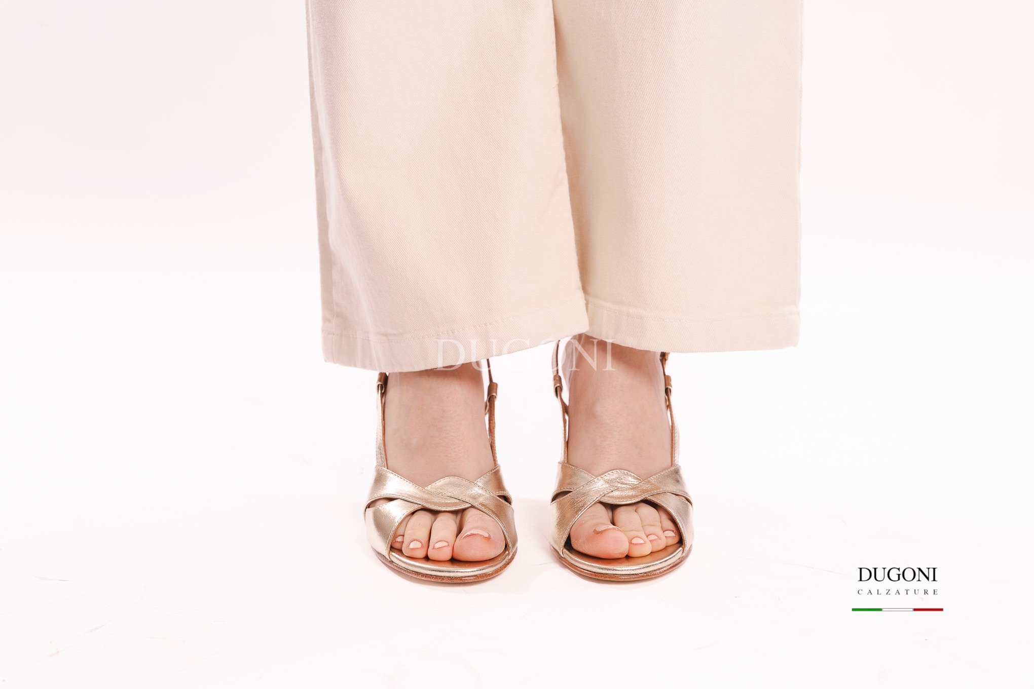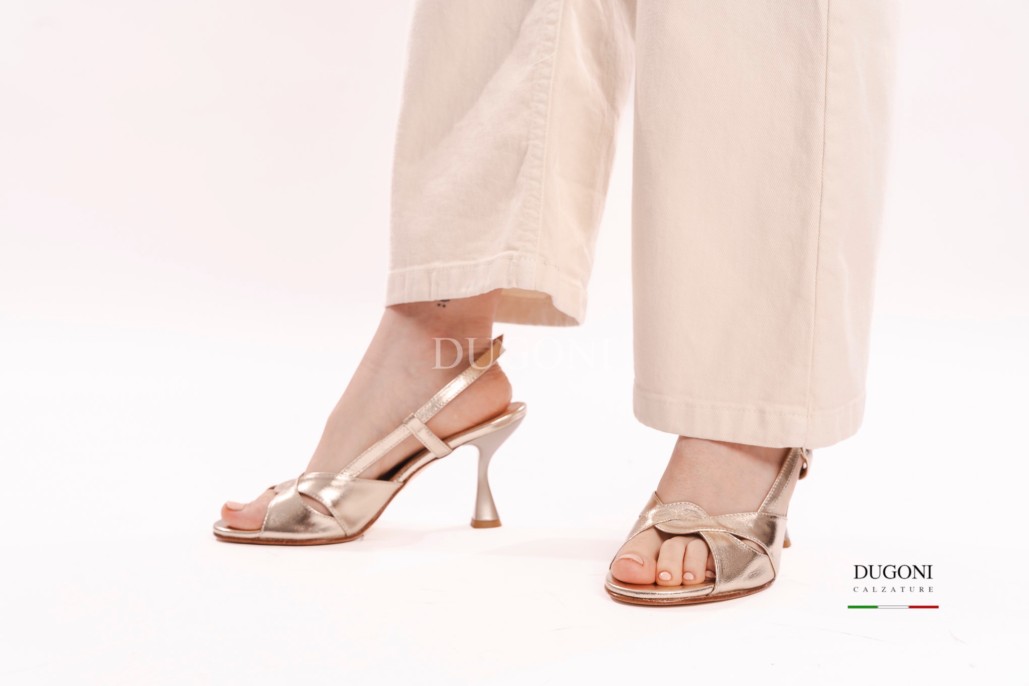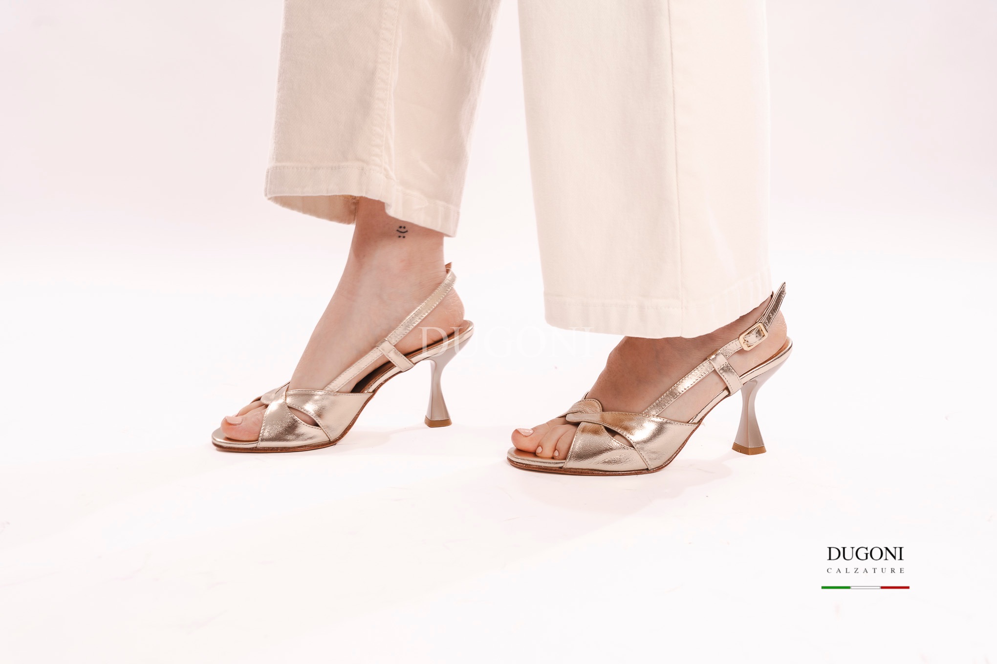Sandalo in pelle laminata platino su dima tonda , con cinturino regolabile . Tacco 90 mm laccato in tinta . Suola in cuoio.