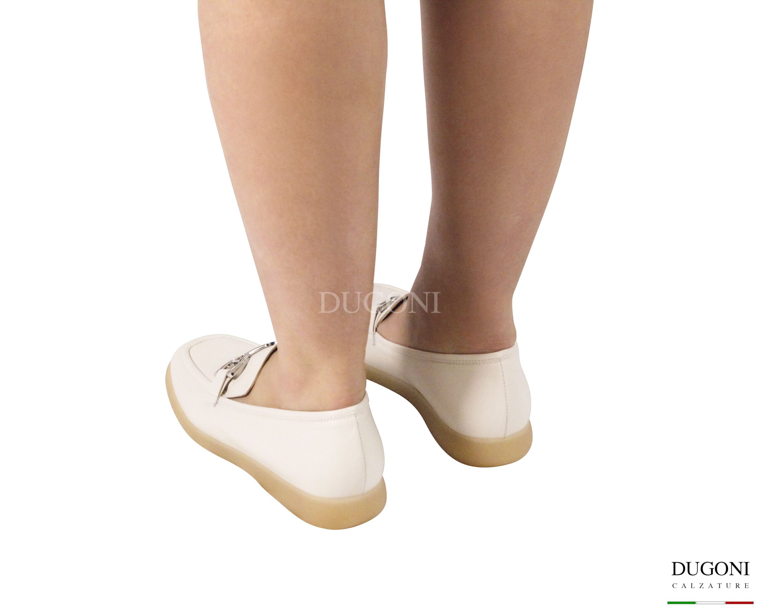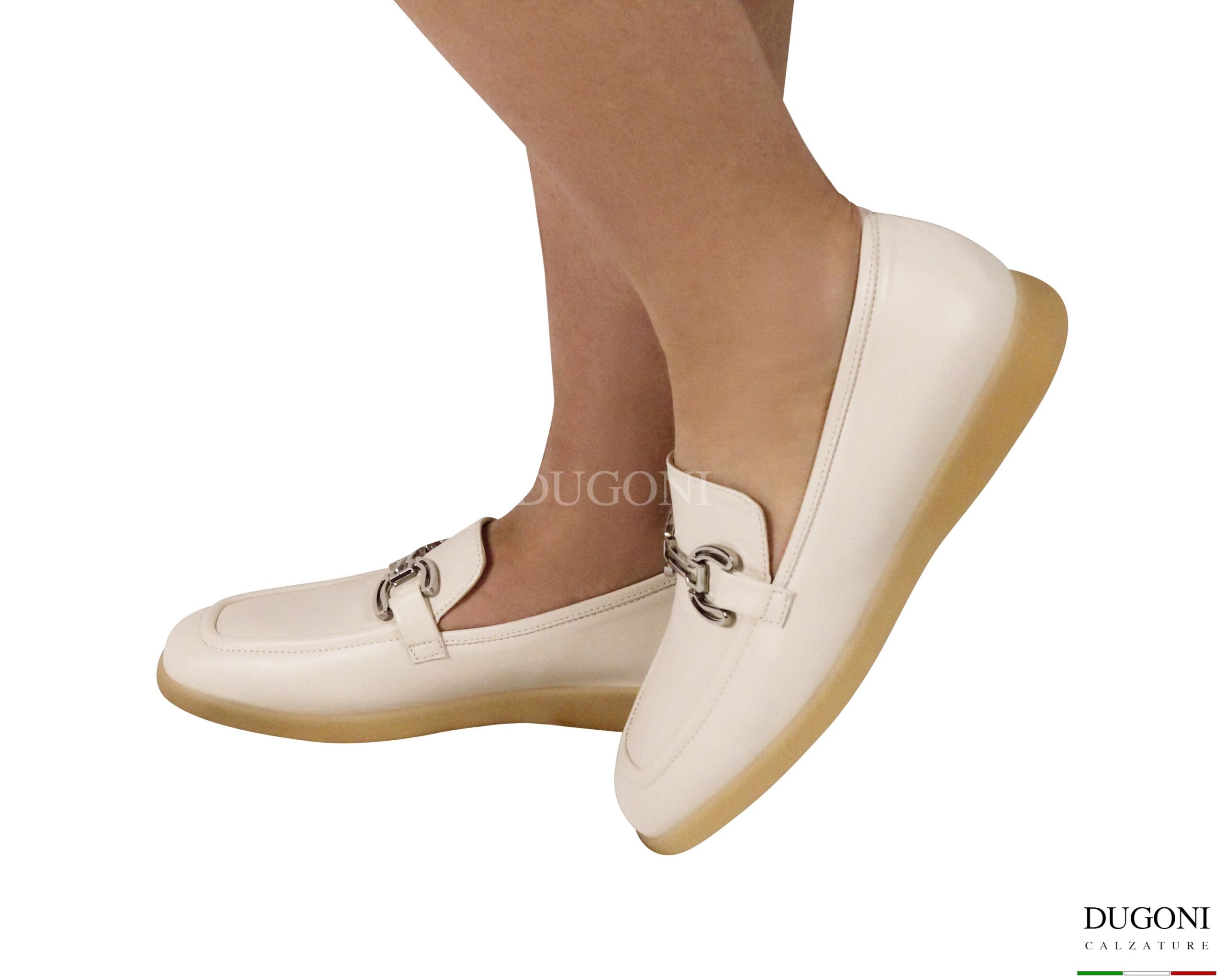 Mocassino in pelle morbidissima in bianco antico con cuciture in tinta e accessorio cromato. Suola frozen  in gomma .